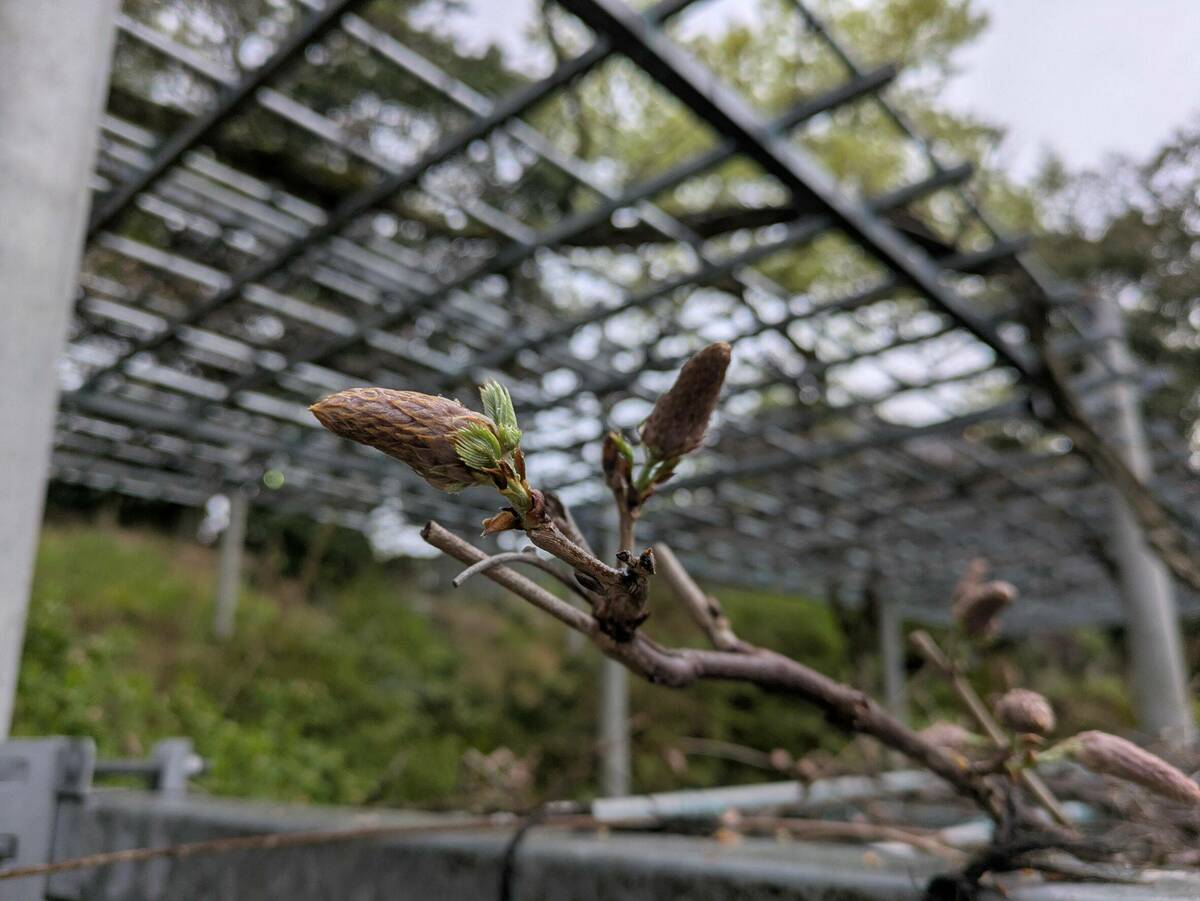 境内の阿知の藤は、毎年多くの参拝者や見物客を魅了する春の名所として親しまれています。花の見ごろに合わせて行われる藤見の会は、倉敷の春を象徴する催しの一つとして、今年もにぎわいを見せそうです。藤の見頃は例年4月中旬から5月初旬。4月7日現在はつぼみが順調に育っています。