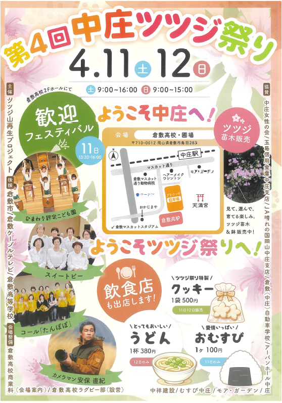 4月11日(土)9時から16時、12日(日)9時から15時の2日間、倉敷高等学校で「第4回 中庄ツツジ祭り」が開催されます。ツツジが美しく咲き誇る里山の姿を取り戻そうと活動する住民グループ「ツツジ山再生プロジェクト」が主催するもので、今回で4回目を迎えます。