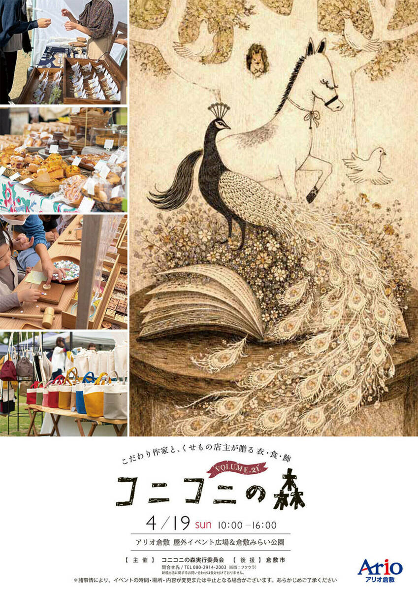 こだわりのクラフト作家と個性豊かな店主が贈るイベント「コニコニの森 Vol.21」が、2026年4月19日(日)10:00〜16:00、アリオ倉敷屋外イベント広場&倉敷みらい公園で開催されます。一部飲食ブースは10時前からオープンし、雨天決行で実施予定です 。入場は無料。
