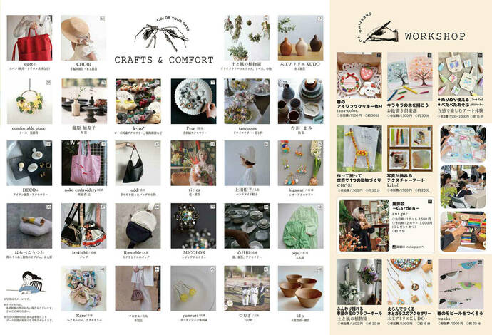 衣・食・飾をテーマに、フード、焼き菓子、豆腐、木工、陶器、刺繍、バッグ、服飾雑貨、花など、多彩なジャンルのブースが約50店以上並びます。岡山県内だけでなく広島、香川、大阪、兵庫からの出店もあり、普段出会えない逸品に出会えるチャンスです 。