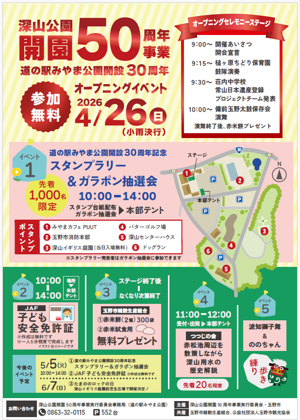 【玉野】深山公園「開園50周年」オープニングイベントが4/26(日)開催。赤米餅の無料配布やスタンプラリーなどお楽しみ満載!