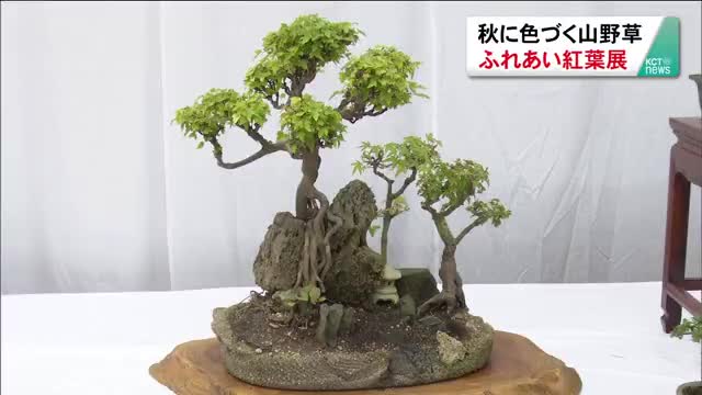 倉敷市児島地区の本荘公民館で、園芸同好会による紅葉展が始まりました。 倉敷市児島塩生の本荘公民館で始まった本荘園芸同好会の「ふれあい紅葉展」です。本荘園芸同好会では、春と秋に作品展を開いています。 今回は、会員6人による85点の鉢が出品され、カエデやススキをはじめ、小さな実がかわいらしい姫リンゴなど、秋らしい植物が並びました。 出品者で最高齢の永田省三さん(93)は、石と植物を組み合わせた「石付き盆...