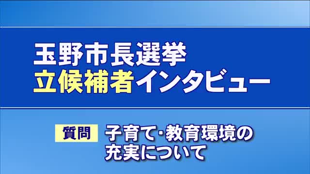 玉野市長選挙 立候補者インタビューです。 きょうから4回にわたって毎回テーマを変えてお送りします。 1回目は、子育て・教育環境の充実に向けて、各候補が重点的に取り組みたいことを聞きました。