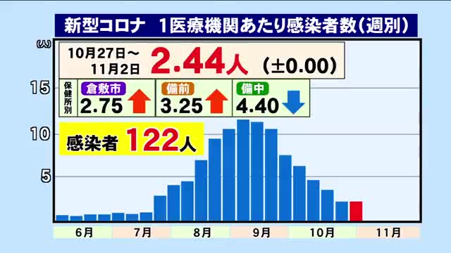 新型コロナウイルスとインフルエンザの感染状況をお伝えします。 先月27日からの一週間で新型コロナは横ばい、インフルエンザは増加傾向となっています。 岡山県は県内50の医療機関で「定点把握」による感染者数を公表しています。 10月27日からの1週間に報告された1医療機関あたりの感染者数は、2.44人で前週から変わらず横ばいとなりました。 感染者数は減少傾向でしたが8週ぶりに下げ止まりとなりました。 年代...
