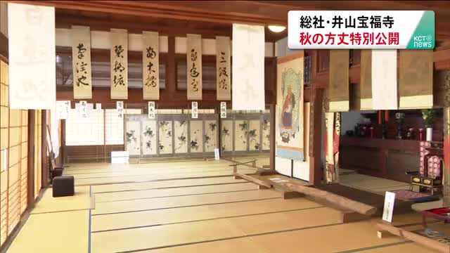 総社市の井山宝福寺で方丈の特別公開があす15日から始まります。 総社市井尻野の雪舟ゆかりの寺・井山宝福寺では、境内の紅葉が色づくこの時期に普段は入ることができない方丈の特別公開を行っています。 特別公開に合わせ、方丈には宝福寺が保管する水墨画や掛け軸などおよそ30点が展示されています。 雪舟が描いたと伝えられる水墨画「達磨大師像」や、3つの掛け軸が1組になった作品などが並びます。 初公開の作品は2つで...