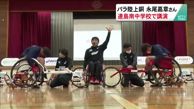 パラリンピック車いす陸上の銅メダリスト・永尾嘉章さんの講演会が倉敷市内の中学校で開かれました。 講演を受けたのは、連島南中学校の全校生徒453人です。 講師を務める永尾嘉章さんは元車いす陸上競技選手で、1988年のソウル大会を皮切りに7回パラリンピックに出場し、2004年のアテネ大会では銅メダルを獲得しました。 講演の中で永尾さんは5歳の時に両足が不自由になるも高校1年生の時に車いす陸上と出会いそこ...