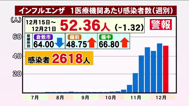 新型コロナウイルスとインフルエンザの感染状況をお伝えします。 今月15日からの1週間で新型コロナ・インフルエンザともに減少しています。 岡山県は県内50の医療機関で「定点把握」による感染者数を公表しています。 12月15日からの1週間に報告された県内の1医療機関あたりの新型コロナの感染者数は1.18人で、3週連続で減少しました。 年代別はご覧の通りです。 0~4歳4人、5~9歳1人、10~14歳1人、...