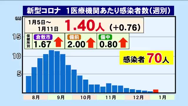 新型コロナウイルスとインフルエンザの感染状況をお伝えします。 1月5日からの1週間で、新型コロナ・インフルエンザともに増加しています。 岡山県は県内50の医療機関で「定点把握」による感染者数を公表しています。 1月5日からの1週間に報告された県内の1医療機関あたりの新型コロナの感染者数は1.4人で、6週ぶりに増加しました。 年代別はご覧の通りです。 0~4歳7人、5~9歳6人、10~14歳3人、15~...