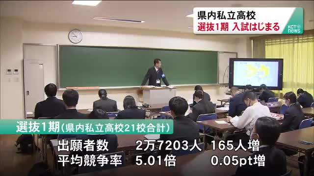 岡山県内21の私立高校できょう(22日)から選抜1期の入学試験がはじまりました。 倉敷高校では、普通科と商業科の試験が、きょう(22日)とあす(23日)の2日間に分けて行われています。 岡山県私学協会によると選抜1期の出願者数は私立高校21校あわせて2万7203人で、去年より165人増えています。 平均競争率は5・01倍で去年から0・05ポイント増え2年連続での増加となりました。 倉敷高校では、普通科...