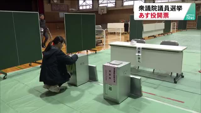 衆議院議員選挙があす投票、即日開票されます。 投票所では、会場の設営が行われました。 小選挙区では、倉敷市全域と早島町の4区に、自由民主党の元職橋本岳さん52歳、中道改革連合の前職柚木道義さん53歳、国民民主党の新人三宅沙侑美さん35歳、日本共産党の新人垣内雄一さん61歳の4人が立候補しています。 総社市を含む3区には自由民主党の前職加藤勝信さん70歳、日本共産党の新人原田亜希子さん53歳の2人が立...