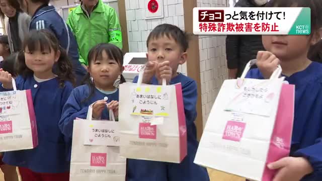 2月14日のバレンタインデーを前にチョコを配って特殊詐欺被害を防止する活動がショッピングモールメルカで開かれました。 ショッピングモールメルカには玉野警察署の職員や地域安全推進員、宇野幼稚園、田井幼稚園の年長児などおよそ30人が集まり買い物客へ特殊詐欺の注意を呼びかけました。 きょうは年金支給日で、買い物に訪れた高齢者を中心に啓発グッズを配りました。 バレンタインデーが近いこともあり中にはチョコレー...
