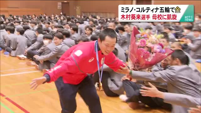 先月開かれたミラノ・コルティナ五輪のスノーボード・ビッグエア競技で金メダルを獲得した木村葵来選手が母校の倉敷翠松高校に凱旋しメダル獲得を報告しました。 木村葵来選手が在校生663人に拍手で迎えられ母校の倉敷翠松高校に凱旋しました。金メダル獲得という栄誉を称え代表生徒から花束が贈呈されたほか菅ノ又泰江理事長から学園栄誉賞が贈られました。この賞が贈られるのはフィギュアスケートの高橋大輔選手と町田樹選手...