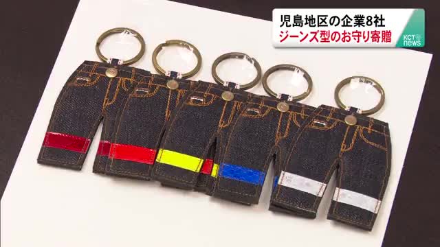 児島地区の企業8社 ジーンズ型の交通安全お守りを寄贈