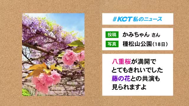 続いては、視聴者の皆さんからの投稿を紹介するKCT私のニュースです。 倉敷市の「かみちゃん」さんからの投稿です。 きのう(18日)倉敷市の種松山で撮影した写真が届いています。 「八重桜が満開でとてもきれいでした。 藤の花との共演も見られますよ」とメッセージをいただきました。 KCTではみなさんからの身近なニュースを募集しています。 メールやSNSで情報をお寄せください。...