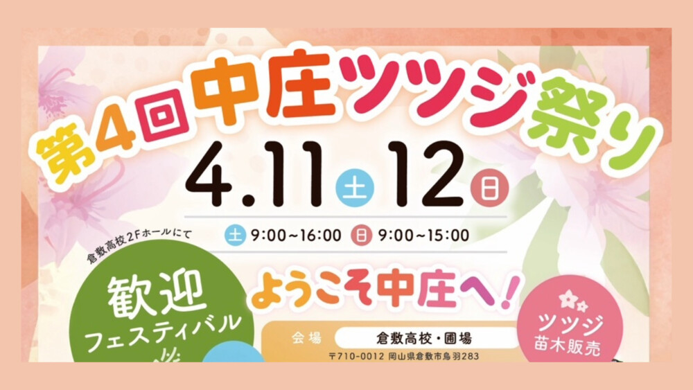 今年で第4回を迎える「中庄ツツジ祭り」が、2026年4月11日(土)・12日(日)の2日間、倉敷高校・圃場で開催されます。 地域の人々が長年にわたって守り育ててきたツツジへの想いと、イベントについてご紹介します♪ 「ツツ...