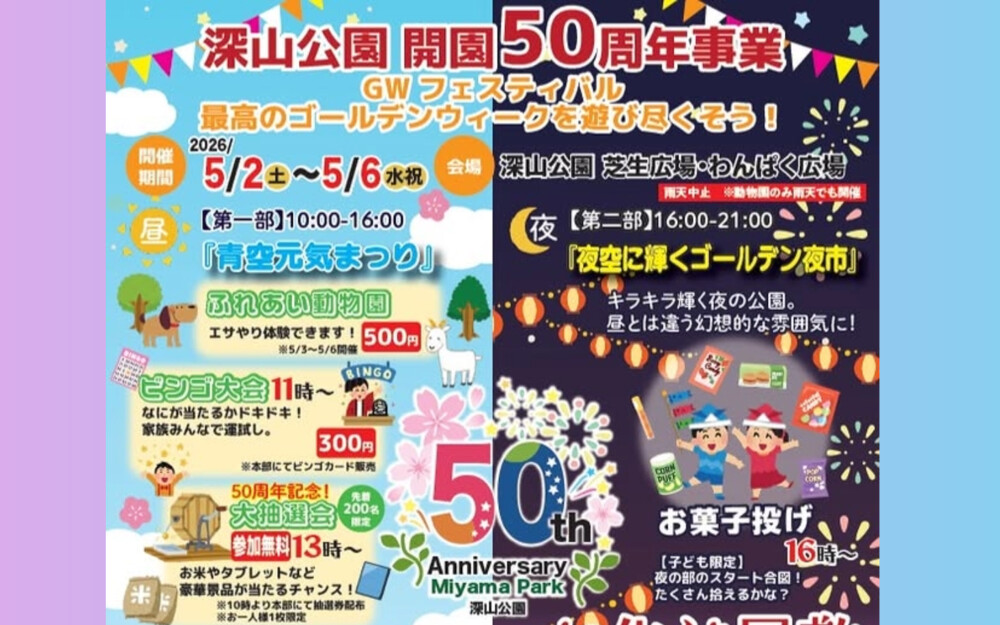 深山公園が今年、開園50周年を迎えます🎉 その記念すべき節目を盛大に祝う「GWフェスティバル」が、2026年5月2日(土)から5月6日(水・祝)までの5日間にわたって開催されます!ふれあい動物園にビンゴ大会、お化け屋敷に...
