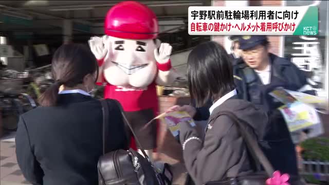 宇野駅前駐輪場利用者に向けて 鍵かけ・ヘルメット着用呼びかけ